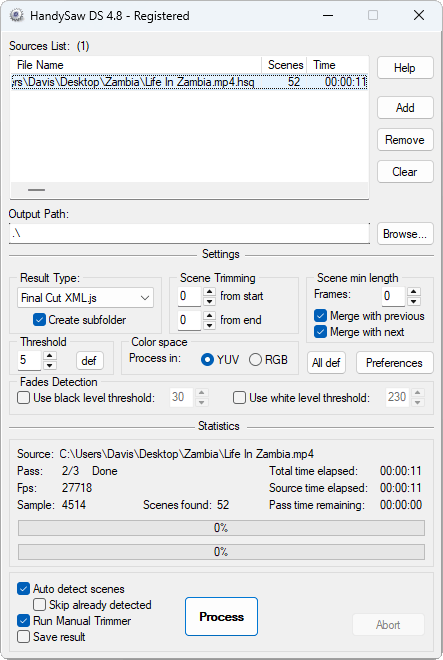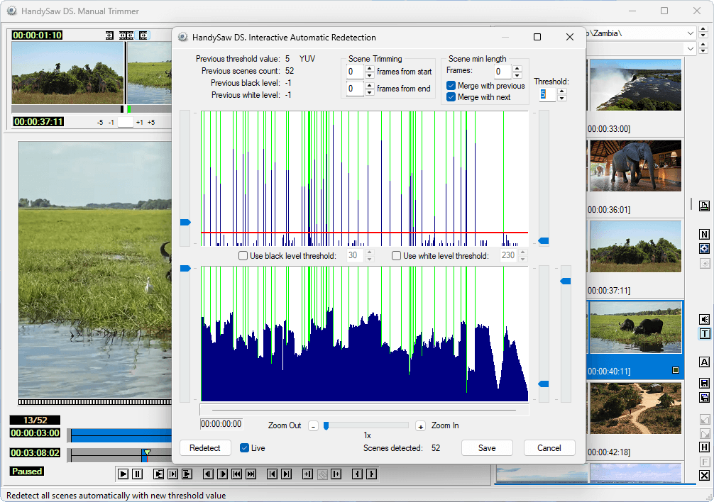 내장 뷰어를 사용하여 감지된 컷을 즉시 검토하세요. 애플리케이션을 나가지 않고도 클립을 자르고, 분할하고, 병합하고, 이름을 변경할 수 있습니다. 이 소프트웨어는 조정 가능한 키보드 단축키와 99단계의 실행 취소 기능을 제공하여 안전한 실험을 지원합니다. 트리머 상세 정보 →